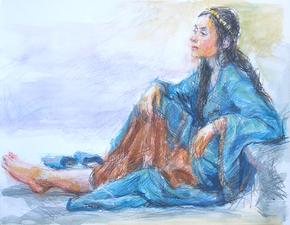 この絵は空色のラシャ紙にモノクロパステル。